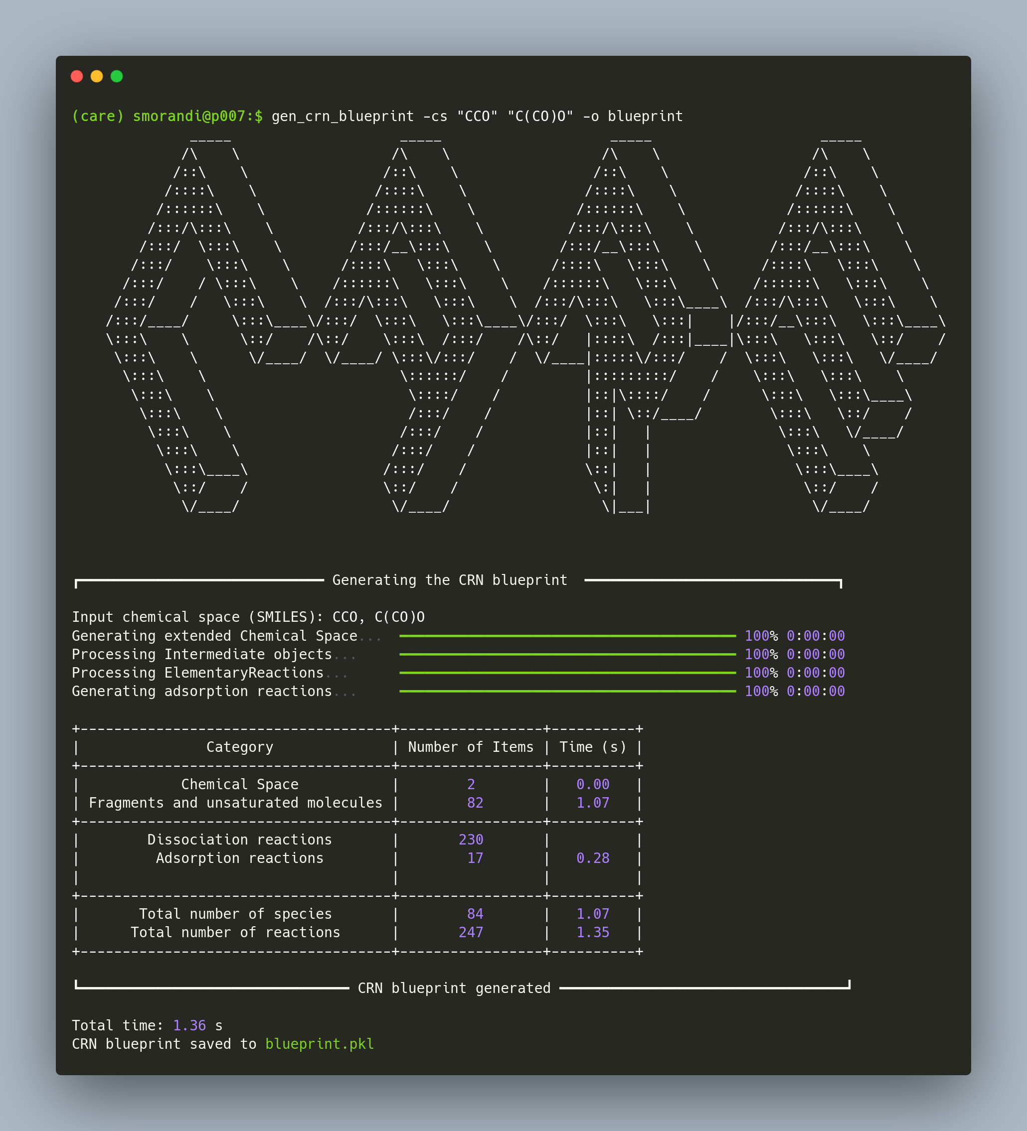 care_run -i input.toml -o output_nameThis will generate a directory output_name containing a crn.pkl with the generated reaction network.