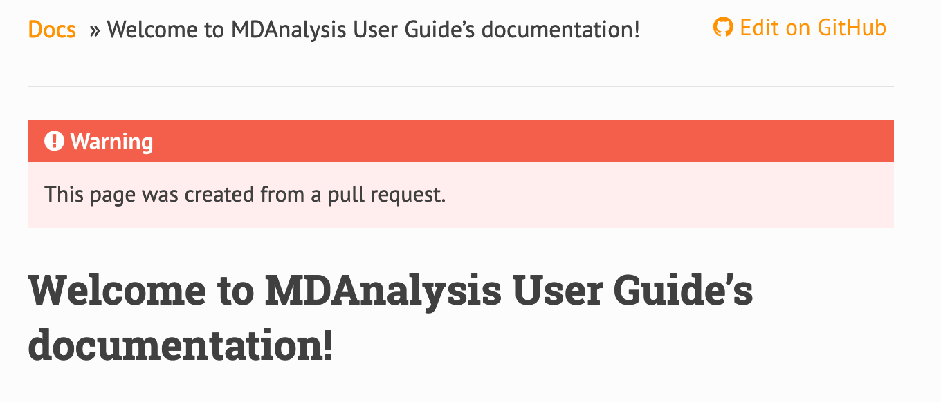 I don't think users need to do anything, we can just turn on "build docs for pull requests" and a little check will appear down the bottom like in this one: https://github.com/lilyminium/UserGuide/pull/1 which builds to: https://mdanalysisuserguide--1.org.readthedocs.build/en/1/ the "mdanalysis" name is already taken on RTD, I hope by one of us, but we can do this for the main repo as well with mdauserguide and mdadocs. After this is merged I might take out the little section on "how to build your own gh-pages" part in the user guide and replace it with "look at the docs in your PR" Edit: I didn't add this warning, it's an RTD thing: |
