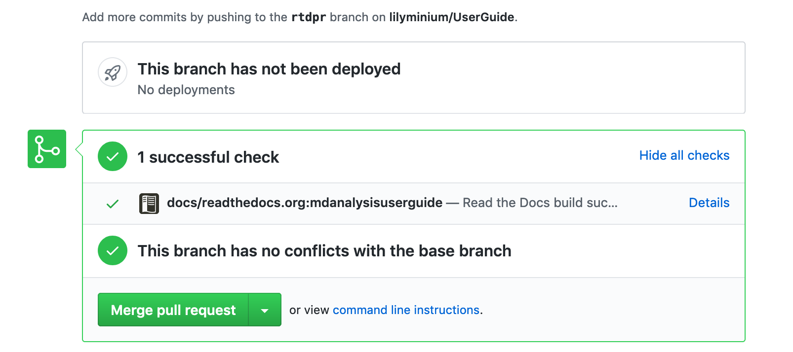 For example, in #76 I built the docs on RTD and could see that some of the code blocks didn't render; but this depended on me merging the PR into a branch on my own fork (so pushes won't automatically trigger re-building) and remembering to toggle it on at ReadTheDocs. Users can also make their own RTD versions but this can clog up the namespace (only so many versions of mdauserguide out there) and there are some minor things to do in settings. It would be much more convenient for the user guide to get built on RTD automatically as part of the PR checks, like below: |