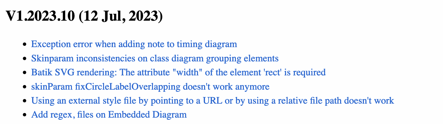 As of 12 July 2023, it seems like PlantUML has just released V1.2023.10. Do I upgrade to that version, or leave it at V1.2023.9? The change log from PlantUML is linked here.