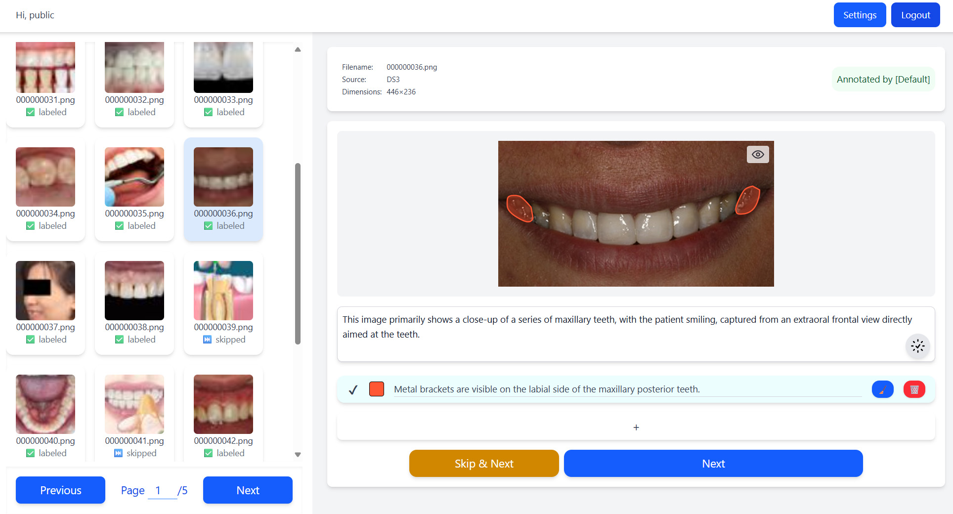 MetaDent is an intra-oral image dataset, benchmark, and an annotation app for vision-language tasks in dentistry. This application is part of the MetaDent project.