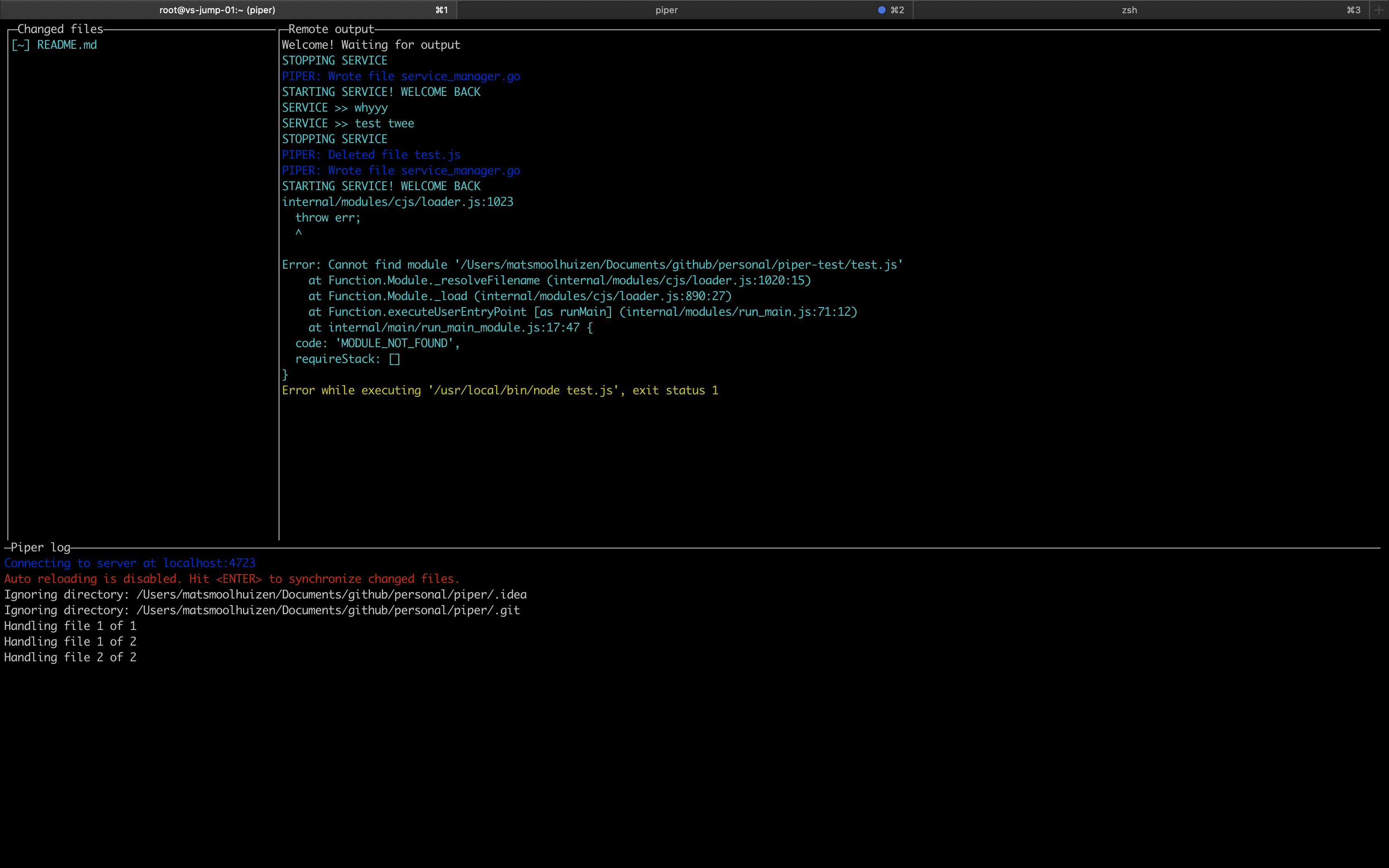 Piper is a service that deploys your code as you write it with a clear overview of what changed as well as its output. Useful for development where you have to run/test your code on a specific environment. It watches your files for changes and uploads them to your server and automatically restarts the service, so you can continue debugging/testing.