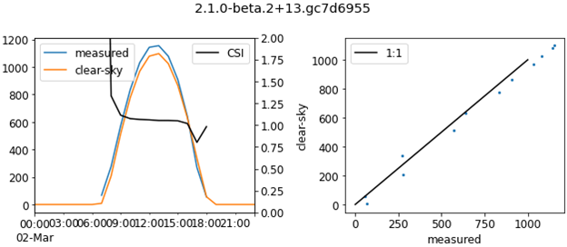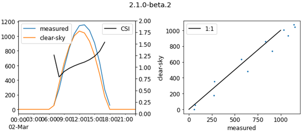 self.poa_global.index, which produces instantaneous clear-sky irradiance, this calculates solpos+transposition at 1-minute scale and then aggregates toself.poa_global.indexto produces interval averages. Check the difference in CSI stability for this example day in the PVDAQ4 notebook (modified to resample the data to hourly averages prior to analysis):
