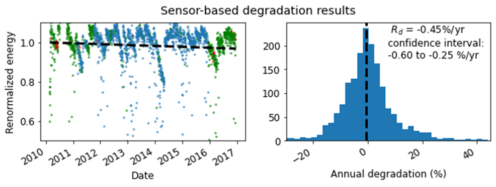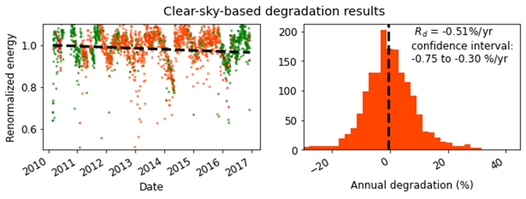 * Model chains (#117) * Add normalized_filter() function to replace the mannual filter in example * Initial working system analysis class * system analysis version that reproduces notebook results Works for both sensor and clearsky workflows * Improve underlying analysis These improvements slightly change the clearsky results relative to the existing version of the notebook. * Allow poa, temperature, and temperature_coefficient to be None This leaves room for BYO modeled PV perofmrance in the future * Add system_analysis to rdtools namespace * Basic example of system_analysis() use * Update degradation_and_soiling_example.ipynb 1) Use apparent zenith in irradiance calculations instead of zenith 2) Apply clearsky filter based on poa irradiance rather than insolation 3) Include ground diffuse in irradiance transposition calculations * Update system_analysis_example notebook Update notes and change initial poa calculation to include ground diffuse * Add a plotting module * Update notebook to use plotting module * Add plotting methods * update system_analysis example notebook * add docstrings * Delete model chain dev notes * add matplotlib to setup.py and update requirements * change matplotlib version * Move docstring to class * renormalization bug fix * Update temperature input interface (Also fix merge bug in plotting) * update docstring for new temperature interface * Remove __init__ docstring * update class name to CamelCase * update kwarg explanatations in docstrings * remove model parameter from calc_clearsky_poa() It is still addressable through kwargs passed to pvlib * Update SystemAnalysis_example.ipynb * Reformat dosctrings to numpy style * command style docstrings * Remove duplicate line * Update plotting docstrings to numpy style * Format normalized_filter docstring according to numpy style Other docstrings in this module have been updated in #125 * Add an ad hoc filter example to the notebook * Fixes system_analysis bug #132 when pv_nameplate is passed into syste… (#133) * Fixes system_analysis bug #132 when pv_nameplate is passed into system_analysis object. * typo fix Co-Authored-By: Kevin Anderson <57452607+kanderso-nrel@users.noreply.github.com> * add bins parameter to plotting.degradation_summary_plot from #132 (cherry picked from commit efcbe2e) # Conflicts: # rdtools/plotting.py * plotting bug fix * Drop py2.7 and add 3.7 and 3.8 to testing (#135) * Drop 2.7 and add 3.7 and 3.8 to testing, update docs. * creating DatetimeIndex directly is deprecated, switch to pd.date_range * require pandas < 1.0.0 * bump requirements.txt numpy to 1.17.3 for testing on py3.8 * more requirements.txt updates for py3.8 wheel availability * Update v2.0.0.rst * add matplotlib to requirements * matplotlib 3.1 * matplotlib * merge pytests and jupyter example * PVLib > 0.7 changes to cell_temp calculation * Modelchain pytests (#196) * pytests for system_analysis. coverage: 91%. * rename system_analysis.py to analysis.py. Rename class to RdAnalysis. Update pvwatts_kws to match Master updates * Allow temp_model_params to either be string or dict with 'a','b', 'deltaT' keys * update calc_cell_temperature for pvlib > 0.6.3, use energy_normalized in normalize_with_pvwatts * Warn if temp coefficient not passed into normalize_with_Pvwatts instead of exit with error. * Add tables=3.6.1 to requirements.txt to allow clearsky analysis * add tables to setup.py since it appears to be a required pvlib for the clearsky workflow and not installed by default. * Add RdAnalysis notebook for pvdaq4 system * add max_timedelta=15T and clearsky poa calculation update to pvdaq4 standard notebook example * Sphinx release notes for 2.1.0 updated and API update Co-authored-by: Michael Deceglie <mdeceglie@users.noreply.github.com> Co-authored-by: Kevin Anderson <57452607+kanderso-nrel@users.noreply.github.com> * Update tests, include tables in setup.py * suppress import warnings for soiling module. * Change warning suppression from warnings.resetwarnings to with warnings.catch_warnings(). Re-run notebooks * Model chains exp energy (#232) * enable normalize_with_expected_energy. * Update RdAnalysis_example.ipynb with manually defined power_expected option. * Add post-filter error check for < 2 yrs data per kanderson * Remove error message for no thermal model if power_expected is passed in. * remove tcell_filter from filter list if power_expected is passed in but not cell_temperature * pep8 compliance * more robust frequency check * shorten long lines * Model chains set clearsky (#233) * Move CS inputs to new set_clearsky function: pvlib_location ,pv_tilt, pv_azimuth, clearsky_poa, clearsky temp, albedo * Explicit error message if set_clearsky not run prior to clearsky_analysis. * remove Py2.7 check in block 3 of RdAnalysis_example.ipynb * boost analysis.py test coverage to 94% * add pv_energy pytest case. Change to ValueError rather than basic Exception when set_clearsky hasn't been run. Co-authored-by: Kevin Anderson <57452607+kanderso-nrel@users.noreply.github.com> * improve index equality conditional * pep8 cleanup * change dict key syntax * Clarify behavior when pv_nameplate is omitted * Useful errors for plotting methods * update requreiments for tables * reduce minimum version of tables * Delete RdAnalysis_example.ipynb * Remove max_timedelta parameter use in PVDAQ example * Move sun position calculation to clearsky section of example This brings the clearsky results into better allignement with the objected oriented example, now sun position is calculated after interpolation on both * Update chage log version number * Allow warning for experimental modules * pep8 analysis_test.py * Change module and class names * Update example with new module/class name * Fix outdated ref to system_analysis * Update api.rst with analysis chains module name * Fix changelog underline length * update index.rst with TrendAnalysis info * poa -> poa_global * cell_temperature -> temperature_cell * ambient_temperature->temperature_ambien