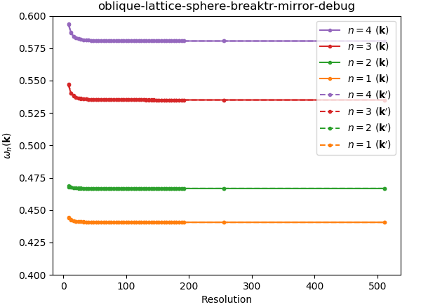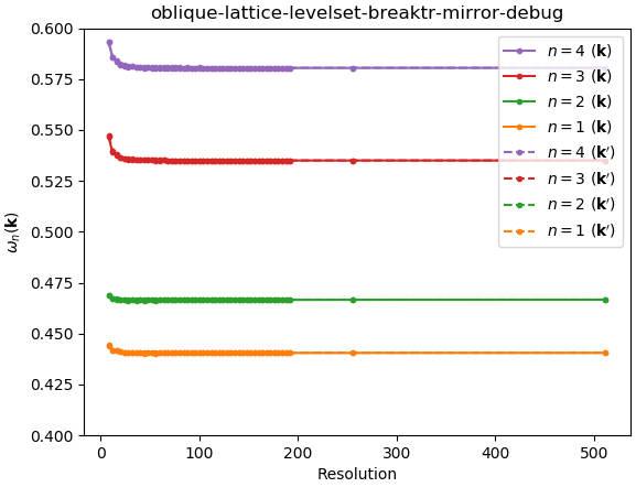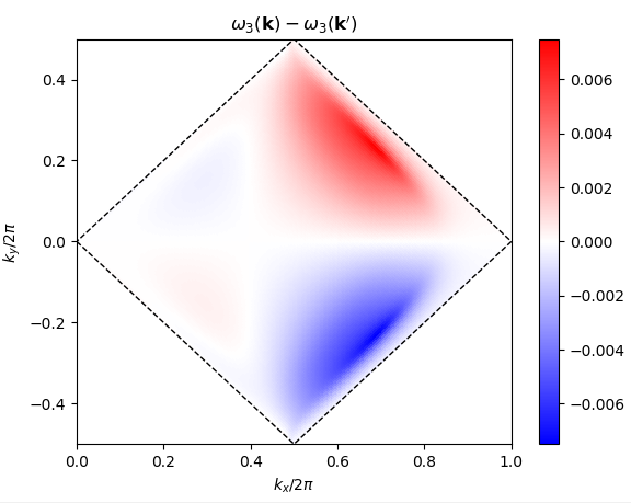 I observe that frequencies ω(k) and ω(k′) with k and k′ related by a symmetry of the lattice differ (although, physically, ω(k) = ω(k′)). This is of course not terribly surprising due to discretization etc., but I find that |ω(k) - ω(k′)| converges far slower/not at all in the above setting. If either of these three elements are removed, good convergence is restored. [edit: actually, turns out changing point 2 doesn't do anything]
