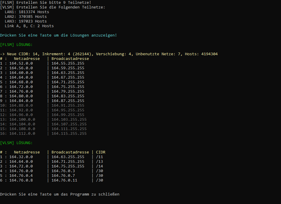 Ein Programm welches Netze mit FLSM oder VLSM in Teilnetze teilen kann. Es kann außerdem Übungsaufgaben zu FLSM und VLSM generieren.