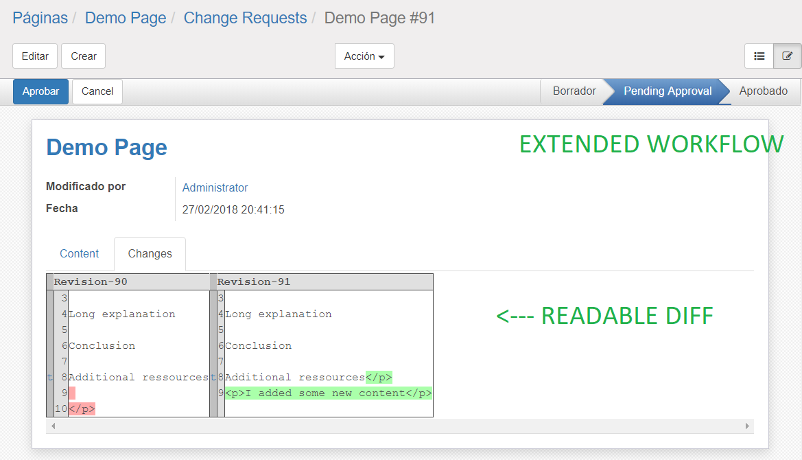 display_contentis deprecated. Replaced with justcontentas a computed field.oncascadewith pages.diffis now a computed field, not just a wizard.diffis now a little bit more readable by hacking in some new lines.name_getfordocument.page.historydocument_page_approvalsets all previous history toapprovedScreenshots