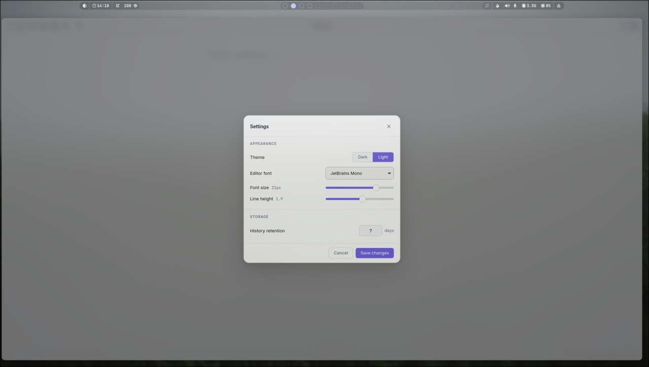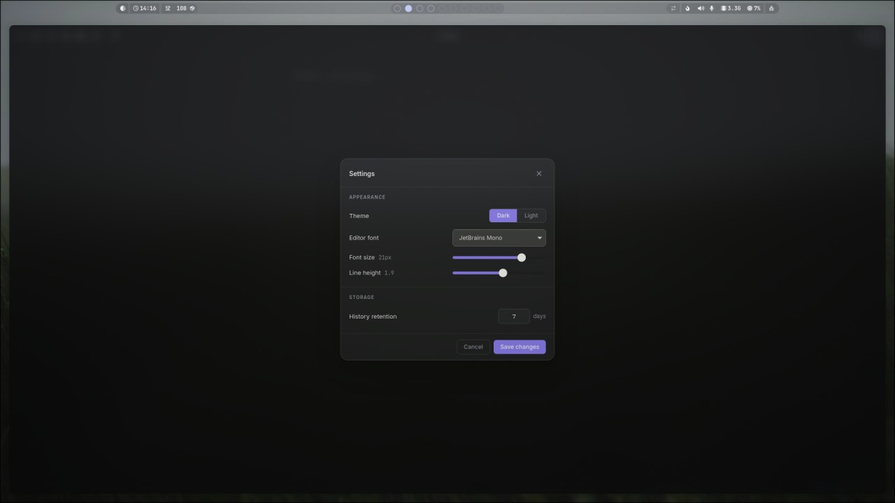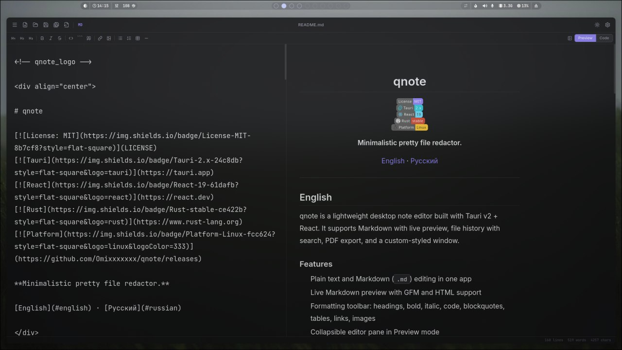 qnote — лёгкий десктопный редактор текстовых заметок на базе Tauri v2 + React. Поддерживает Markdown с живым предпросмотром, историю файлов с поиском, экспорт в PDF и кастомное оформление окна. Работает на Linux и Windows.