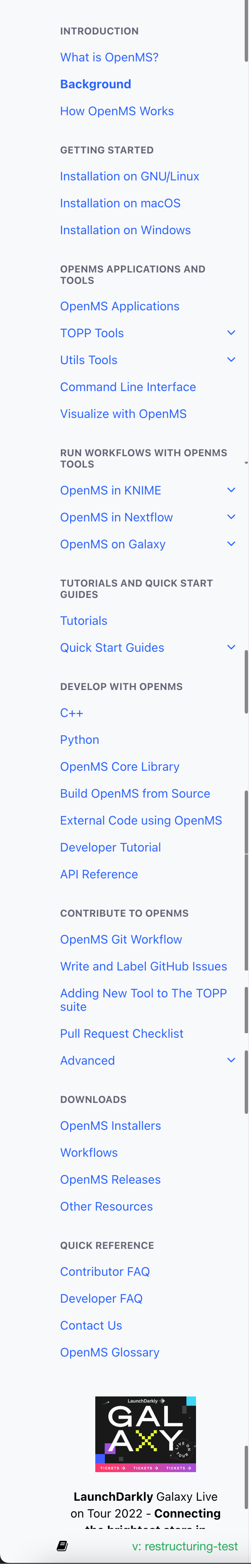 * Address review comments by @greengypsy Ref: #65. * add: exact syntax for adding admonition * add: soon to be deprecated important admonition for toppas * add: remaining toppview-introduction content Closes #76. * prettier: ui enhancements Fixes #66. Fixes #71. Closes #79. Fixes #81. * fixes: merge conflicts * Major fix of installation instructions * Fix * Fixes to tabbing * whitespace * [FIX] allow crosslinking in markdown * Update conda instructions for macOS * try different link syntax #93 * Try adding autosection #93 * Revert "Try adding autosection" This reverts commit e1f5b66. * Revert "try different link syntax" This reverts commit 940fbdf. * Revert "Update conda instructions for macOS" This reverts commit 4e7cf57. * Revert "[FIX] allow crosslinking in markdown" This reverts commit 0241aa2. * Revert "whitespace" This reverts commit 83540a0. * Revert "Fixes to tabbing" This reverts commit b46d112. * Revert "Fix" This reverts commit eaf3a63. * Revert "Major fix of installation instructions" This reverts commit ab7106e. * Documentation urls check (#114) * added action.yml * created workflows folder and added action.yml to workflows * moved workflows to .github * fixed pull request checklist deadlink * set max-depth to 2 * set max-depth to 7 and change link in toppas.md * edited action.yml and fixed links * added a config.json file for action.yml * corrected action.yml * made discussed changes to action.yml file * added quotation marks to main branch * added current branch to check if script works * removed rst extension * fixed indentation in action.yml * added current branch * added full file path to config.json * added current branch again * added base braanch as develop * base-branch * set base-branch to staging * remove current branch * Restructure and Rearrange OpenMS RTD Documentation (#112) * Add toppview tutorial (#119) * fixed xml code block in key concepts * added TOPPView tutorial * added additional topics to visualize-with-openms.md * rearranged files and added content * fixed image urls and fixed additional topics link in visualize-with-openms.md * edit image links so I can see them live * resize file-import-options.png * resize filtering options * add a sentence to getting started section in visualize with openms * added cross-linking description, added external links to toctree in index.rst * deleted unnecessary files as they are external links. changed toctree caption for core library and pyOpenMS * added knime and galaxy descriptions * added knime and galaxy descriptions * removed extra hash from url in openms-in-knime.md * fixed some alignment issues with the list and made major steps bold in knime description * fixed list in knime description * addressing issues raised * create build from source and delete sections from installation guides * restructured folders * remove redundant files and add proteomicslfq.md file to main suite * added a message on the developer tutorial saying it is under construction * removed TOPPAS tutorial and OMSSA references * add full stop * deleted some files, added a under constructed message for nextflow, and polished the galaxy section * minor correction in glossary. added image to how openms works * add link to KNIME tutorial * added note in how openms works, added construction message to core library page and added link to openms api reference * build custom knime plugin * change galaxy website link * change galaxy website link * added full stop and description to tutorials section (nextflow) * initialized structure of tutorial * testing first note * adding user tutorial to index * correct mistake in file path in index.rst * added images and a footnote * added more content including fig 5 * try to render R code * try to render R code * added knime-setup images, adding references * fix references * fix references2 * fix references3 * fix references4 * add metabo image folder and added task admonition * fix render of fig 9 * trying to fix task admonition rendering * added html admonitions to conf.py myst-enable-extensions. Structured task admonition * tried to add tip inside task admonition * fix rendering of bold text and title for tip admonition inside task admonition * trying to make title in admonition more visible * added labelfree images * added a number of images to the labelfree folder and added more content to user-tutorial * fixed url to image 12 and caption for table 1 * add handout-clean.css * removed purple background from task admonition * added matrix image. adding mathjax to render log equation * edited log equation * use amsmath instead of mathjax * add math directive to equation * added more content up to chapter 4 protein inference * up to statistical validation of protein inference results 4.2 * changed rconsole to r for codeblocks * trying cross-referencing * added numref to conf.py and trying out link in openms-tutorial * added numref to conf.py and trying out link in openms-tutorial * trying to get linking to figures working 1 * trying to get linking to figures working 1 * trying to get linking to figures working 2 * trying to get linking to figures working 3 * trying to get linking to figures working 4 * added more content to user tutorial * up to 6.3 of user tutorial * fixed some links and rendering of tables. Also tried to link footnote to external website * added references as footnotes * test using VS code editor * up to spectral library search * up to OpenSWATH chapter 7 * up to OpenSWATH chapter 7 * changing the custom css of the question admonition * fixing color of svg question in question admonition * edited custom css and up to 8 OpenSWATH for Metabolomics * up to quality control * added quality control and faqs * added links in references * added metababolomics preprocessing tutorial * added workflow tutorial to index.rst * added link to empty idXML file to untargeted metabolomics preprocessing file * made changes to tutorials.md * changed task admonition icon * add url prefix and brackets to variab
