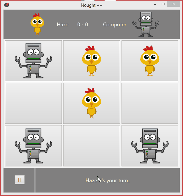 Nought++ is an enhanced version of the traditional noughts and crosses game. This game was developed in JavaFX. The home page is where the user can change their image, name, view the abouts page and the recent scores page. The main home screen looks like this.
