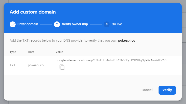 stagingof eitherpokeapi.coorapi-datawill be pushed then the job will deploy the artifacts based on their aforementionedstagingbranches to a new Firebase staging environment (https://pokeapi-test-b6137.firebaseapp.com) (I will give access to @phalt, @tdmalone, @cmmartti to this Firebase project). It would be also nice if @phalt could create the subdomainstaging.pokeapi.coand link it to the Firebase project. To do so we should create the new domain, add aTXTrecord type withhostequal to pokeapi.co andvalueequal to google-site-verification=gV4NnTbUxNds2dIATNVlEyHCfWBgOjte2cNuAdlIVA0. Then probably we need to add the Firebase nameservers to the Namecheap domain config. I will also need to change some strings here and there in the PR I just opened.This PR is linked to the following PRs: