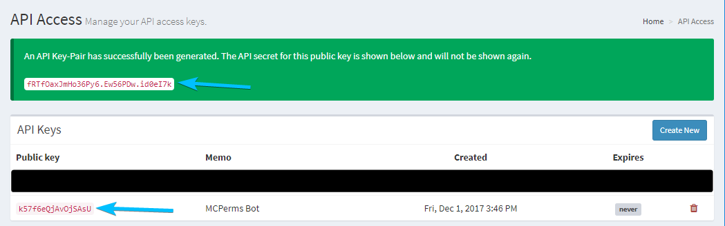 - Navigate to the "API Access" page within the panel and generate a keypair like so:
