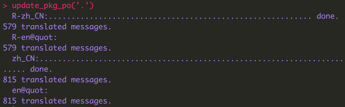 * initial exploration of adding a chinese translation of messages working version of chinese translation * adding another .mo file that was untracked * trying to get the .pot for src/ files * adding warning()s from C * C messages with DTPRINT or Rprintf * adding STOP messages * DTWARN messages * Error in forder * odds&ends more messages * cannot use _() with \r * update .pot for src files * moving pot file to po/ * update header metadata for src .pot * run update_pkg_po on the src to get mo files * update_pkg_po after merge * add template message in onAttach() & clear typos/PYDT issue along the way * remove some strings * improve arg checking&message in groupingsets; add some messages * get tests working (fix some bad quotes, adjust to new messages) * update po with latest message edits * Finished the translation assigned to Chun-Hui Gao (#3983) * Finished the translation of line 3058-3231 in po/zh_CN.po. Totally 34 messages. * Finished the translation assigned to Chun-Hui Gao in R-zh_cn.po. Lines 1500-1598 in original R-zh_CN.po. Totally 26 messages. * Resolved reviewer's comments. * Resolved reviewer's comments. * (hopefully) apply encoding fix & check compilation * improve internal error & regenerate messages * Finish translation to zh_CN assigned to group 2 (Hongyuan Jia) (#3986) * Finish translation. * Resolve review comments. * balance quotes * extra nocov * some coverage of fmelt * complete coverage of fmelt * fix test error * update message per DeLuns feedback * update message again; some minor tweaks to nearby code * Translation to zh_CN assigned to group 3 (#3985) * translate assigned to group 3 * translate assigned to group 3 * translate assigned to group 3 * remove merge conflict vestiges * remove merge conflict vestiges * plonk * update translation * minor update * added new message caught by xianghui * Translation haogao gu (#4002) * R-zh_CN_2019-10-26 * 10-26 * restore previous * updated with feedback * regenerate with small fix * regenerate .mo files * Translation finished (soappp) (#4023) * readme link examples, rm old link to a talk (#4001) * Homepage additions (#4006) * pkgdown, keep manual tab, link cranlike page, minor rename (#4008) * fix Rd warnings (#4011) * use Rdevel for revdeps due to bioc-devel (3.11) now needing R 4+ * (hopefully) apply encoding fix & check compilation * improve internal error & regenerate messages * Finish translation to zh_CN assigned to group 2 (Hongyuan Jia) (#3986) * Finish translation. * Resolve review comments. * balance quotes * extra nocov * some coverage of fmelt * complete coverage of fmelt * fix test error * update message per DeLuns feedback * update message again; some minor tweaks to nearby code * translatation completed * fixed somme message 1 * fix format tags for two translations * done some translation! * Finish translation to zh_CN assigned to group 5 (Leo Lee) (#3995) * chinese translation by Leo * Update R-zh_CN.po fix a typo * Update zh_CN.po * add missing quotes * number out-of-order format strings * apply numbering to formatters * Update R-zh_CN.po & Change author * Fix the problems of missing %d in zh_CN.po & Polish translation * Translation dracodoc (#4034) * 895 - 939 * 945 - 1007 * To the real 1007 line msg * convert enconding from GBK to UTF-8 * Revert "convert enconding from GBK to UTF-8" This reverts commit 6e65d0e. * translate start and end of assigned msgs. * till 1899 * two entries then found possible problem of missing messages * 10 missing message not captured? * till 1962 * finished assignment * review and edit * update meta info * macro-within-macro removed * syntax error -- split ternary operator * roll back use of translation in ASSERT internal errors * Update according to @shrektan's comments * re-run update_pkg_po * update binaries * Translation caiquanyou (#4039) * finish translation * Update R-zh_CN.po * Update zh_CN.po * update mo files * translation(partial) into zh_CN by Yuanchen Xie (#4010) * translation(partial) into zh_CN by Yuanchen Xie * Add new translation results, based on messages * update mo file * update transitions as renkun-ken's suggestions * update binary mo * update vs recent master * Translation to zh_CN - Group 7 (#4019) * translate R msgs * src error messages * missing quote * missing quote * remove extra quote * fix-up of merge * update po after merge * update fuzzy translations * update mistaken PRIu64->PRId64 * caught a few more failed merges * line # update * rerun update_pkg_po * Translation shawn (#4050) * done some translation! * done some translation! * done some translation * revised the translation * small tweak * Translation yilei (#3989) * messsage * messsage * messsage * messsage * messsage * done some translation! * done it. * updating some small misses from last pull * Translation to zh_CN assigned to group 12 (#3987) * Update translations * Minor refine * Minor reformatting * no longer using %llu, other small tidying * Translation fengqifang (#3990) * First version, finished all message * 2nd one, multiple lines of msgstr * 3rd, finished * zh_CN.po 1st * after zh_CN.po reviewed * fix encoding issue * manually editing per GH UI submission * run update_pkg_po on new merge * done some translation (#4069) * done some translation * do some revisions * touch-up * Translation to zh_CN assigned to group 4 (#3997) * finish R-zh_CN.po * finish zh_CN.po * finalize two files * change author * make the package * finalize the messages * change the format of numbering * install the pacakge * delete excessive src folders * manually revert coding issues (open to a better solution... `iconv(bad_str, from = 'GBK'|'GB18030', to = 'UTF-8')` both returned something gibberish-y. * update mo files * update .mo * add in suggestions from gaospecial * update mo * My part of translation has been completed. It's so happy! (#4051) * messsage * Update R-zh_CN.po * Update R-zh_CN.po * Update zh_CN.po * some revisions due to foreign char, touch-up, remove fuzzy * Translation yuliang li (#4055) 