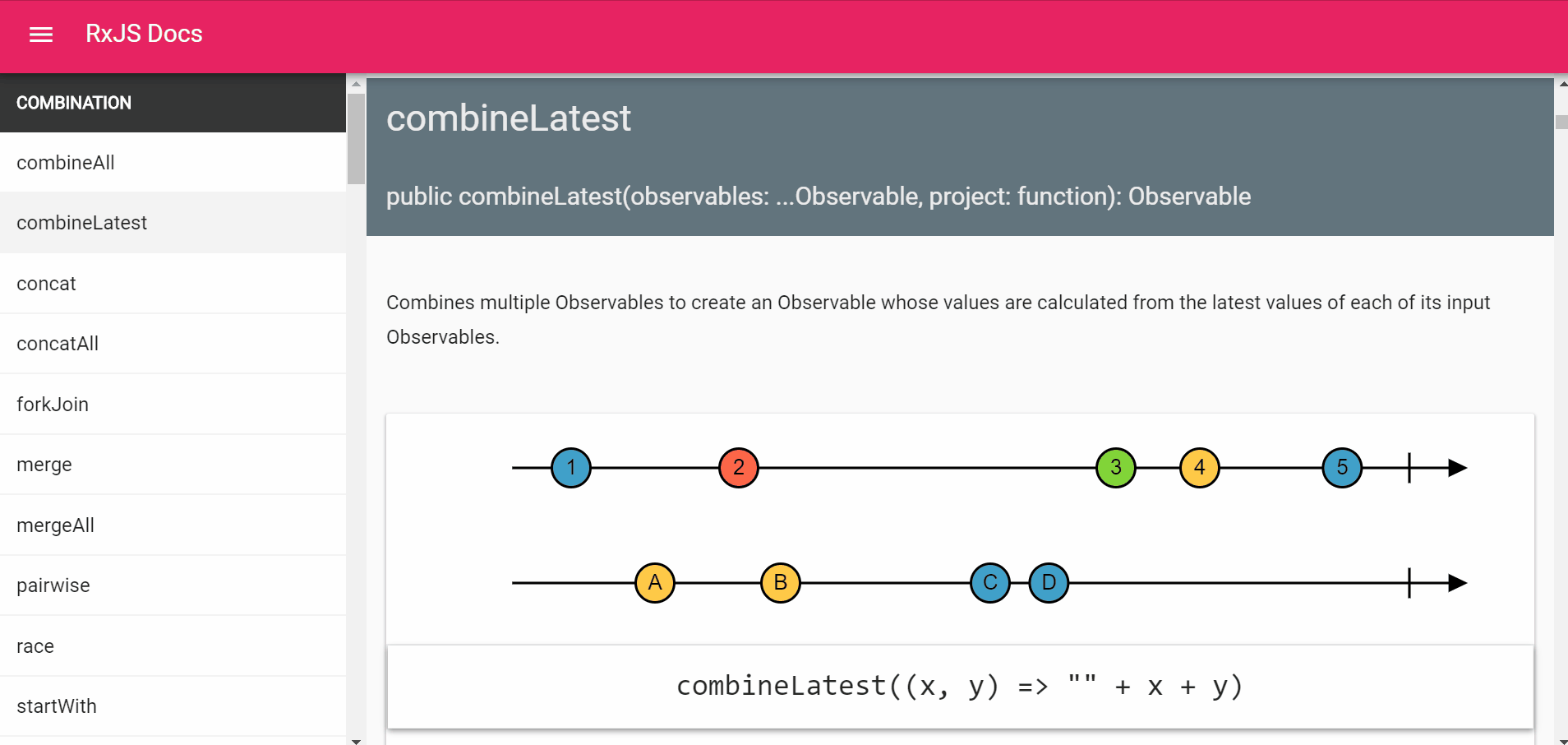 combineAllandcombineLatest.The static operator content is split into individual files, I figured this would be easiest for contributors to consume, or it can be extracted into a document db or similar if we choose to go that route in the future. I'm currently working on combining the content and examples from the official docs with relevant examples from learnrxjs.