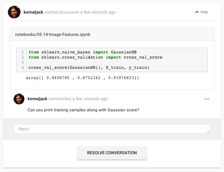 Your colleagues can then write a reply or resolve/unresolve conversation and so on. All changes to the conversation are reflected in the corresponding issue comment. That's how we worked around GitHub's limitation and enabled conversations for large notebook diffs (yayy!).