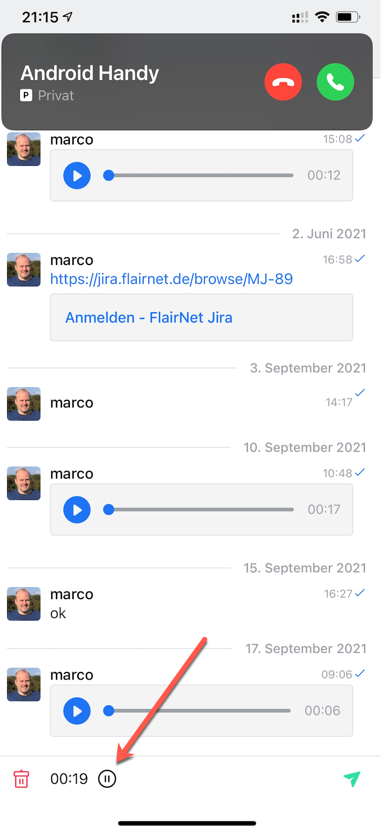 This is an incoming call. As soon as IOS stops the recording, I'll indicate this with the "pause" symbol behind the time display. The time is stopped and shows the length of the message.