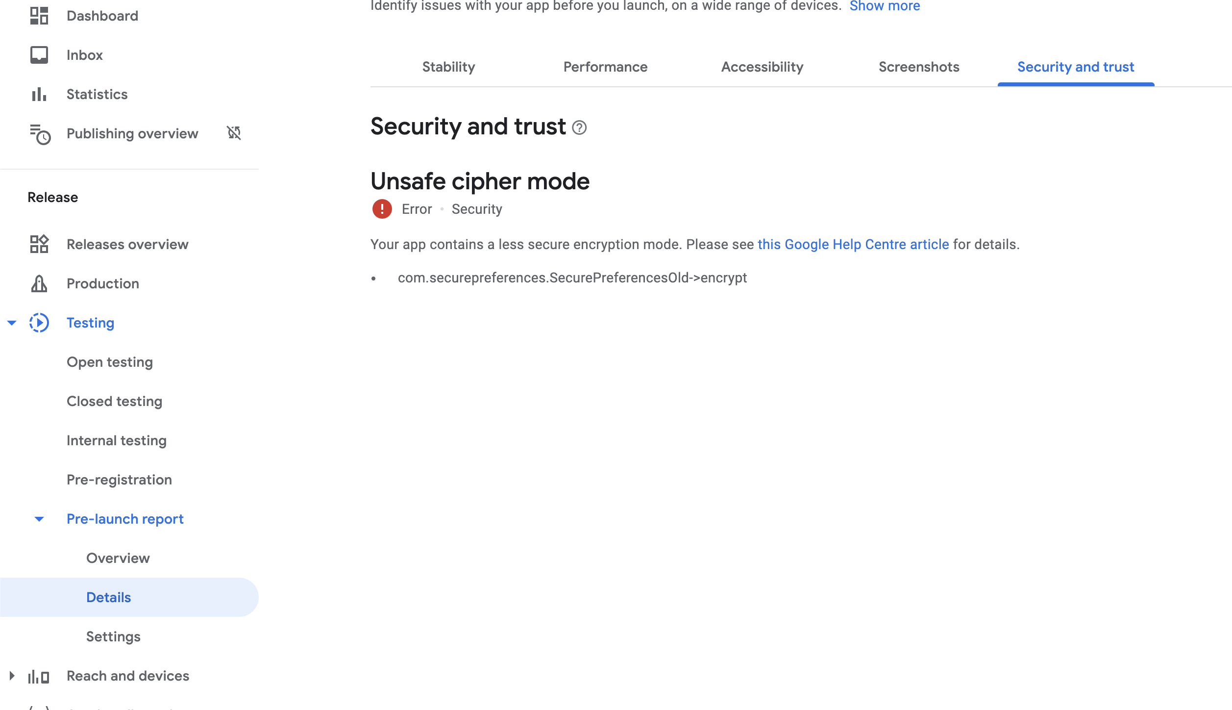 AES/GCM/NoPadding. Besides that, deprecatedcom.scottyab:secure-preferences-libwas replaced with saferandroidx.security:security-cryptoIssue(s)