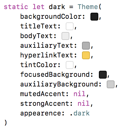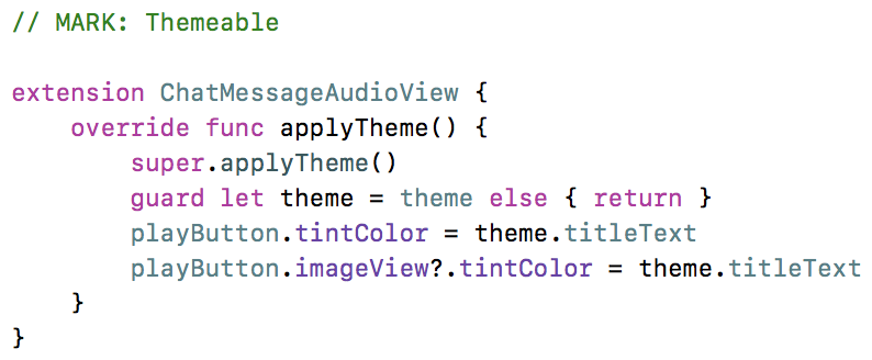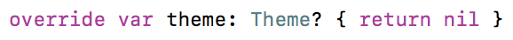 applyThememethod onUIView. This method comes from the conformance to theThemeableprotocol. Here you can set the colors on the UI components. This is usually done in an extension. Accessing thethemeproperty, will enable you to use the key colors associated with that theme.The base implementation of