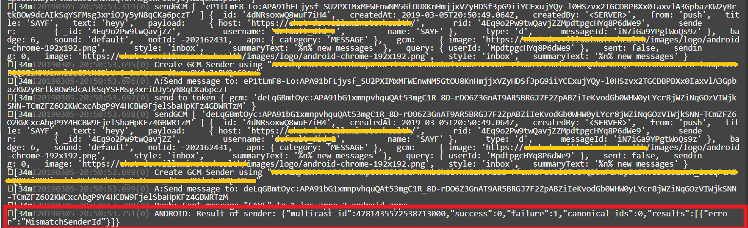 Push Notification: Log shows as sent but after few seconds FCM returns a MismatchedSenderId error.