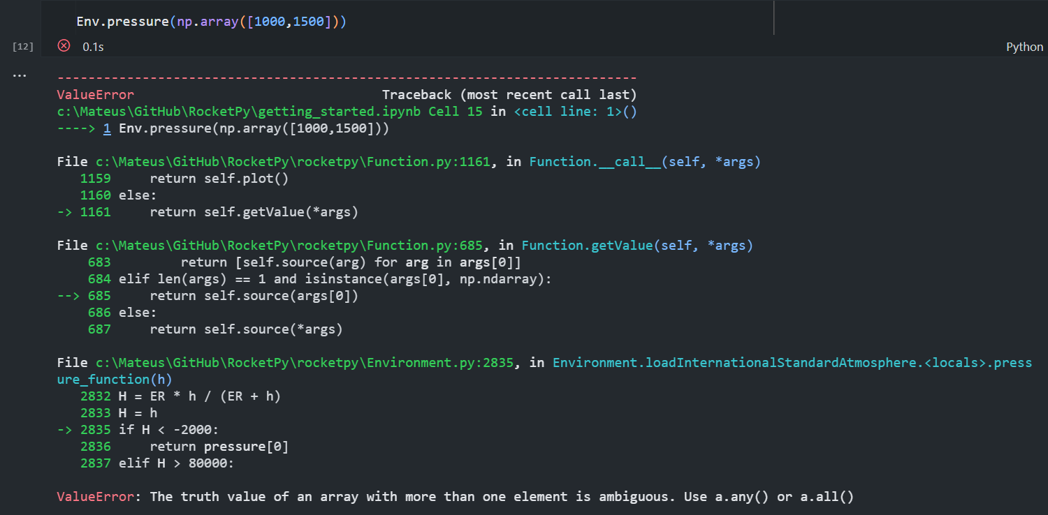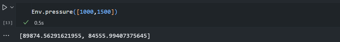 Flight.plotPressureSignalsmethod did not work. This was just because the__calculate_pressure_signalmethod was not being called. Furthermore, when using"StandardAtmosphere"thePressure at Rocket's Altitudeplot raised an error. This error comes from callingEnvironment.pressurewith an array as such:Using a list instead works fine: