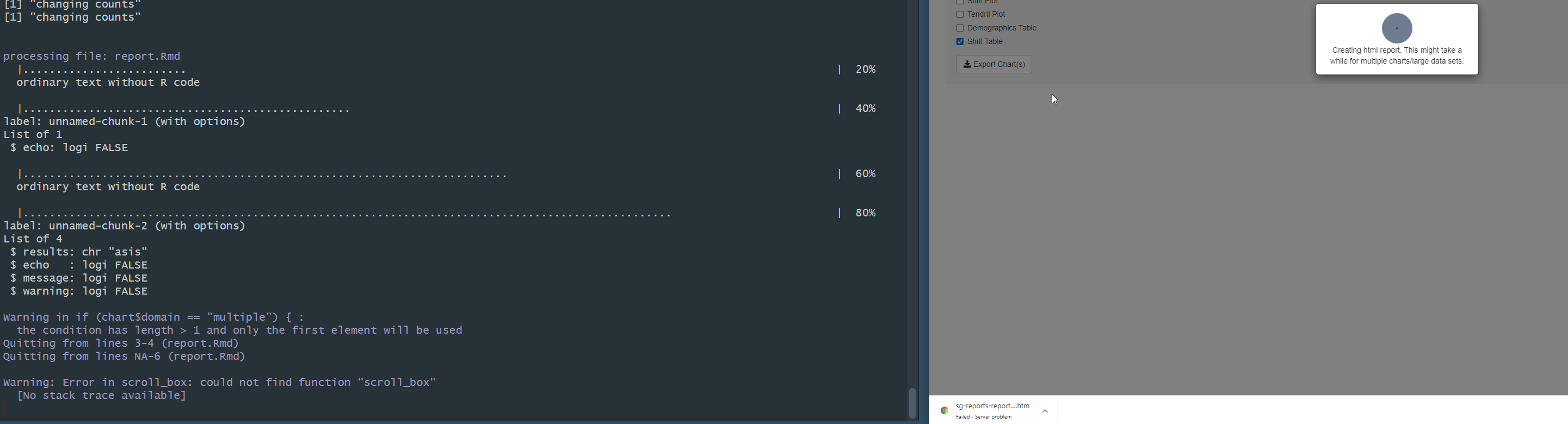 This line doesn't run if report fails - Demographics Table, Shift Table - and spinner just spins.