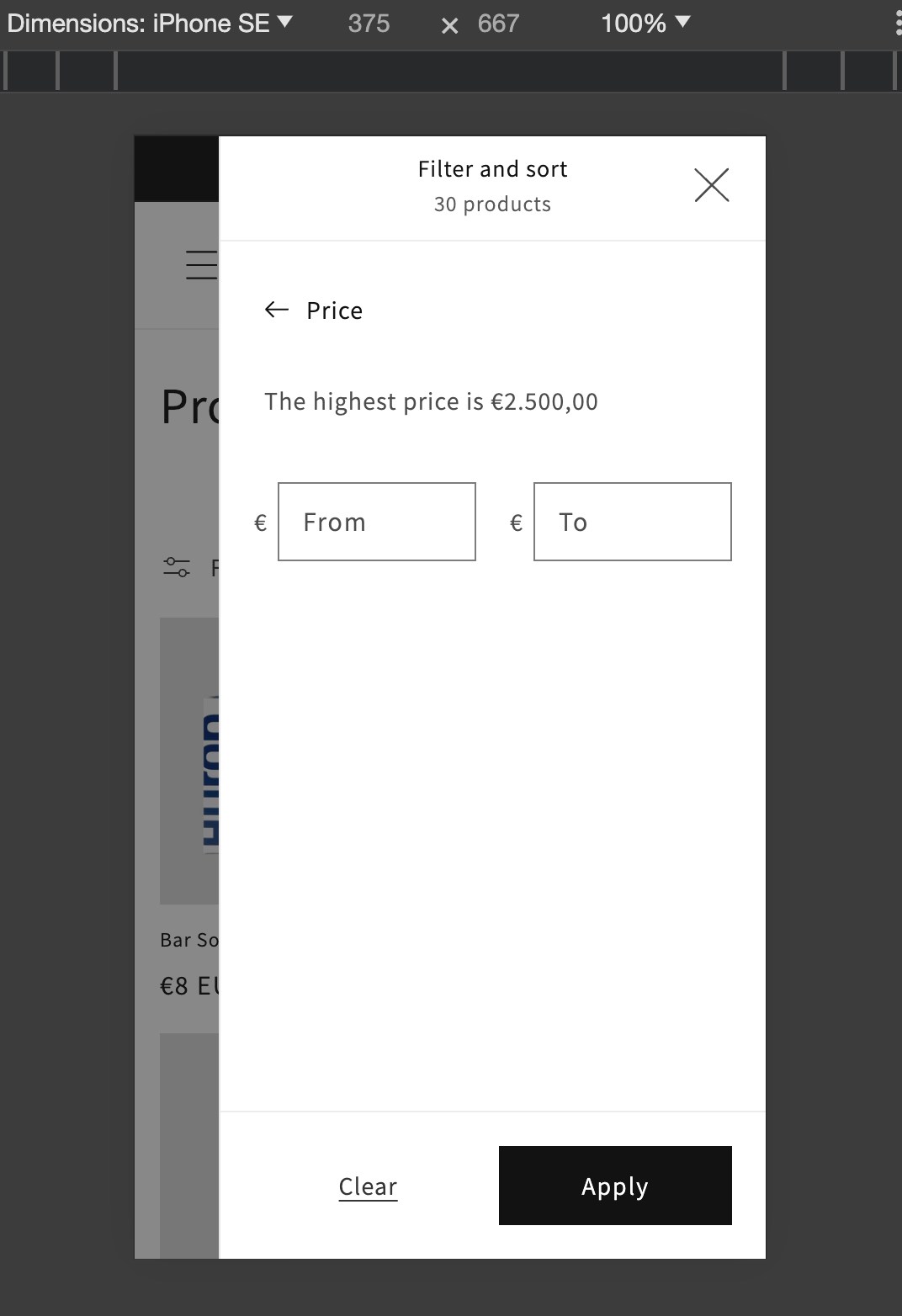 type="text"and made some adjustments to the Javascript to only allow the buyer to type relevant characters and use meta key functions.I also consolidated the price filters into a snippet to remove the code duplication between the mobile and desktop filters and made the active filter look better by adding a