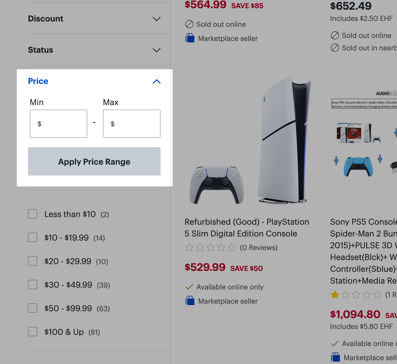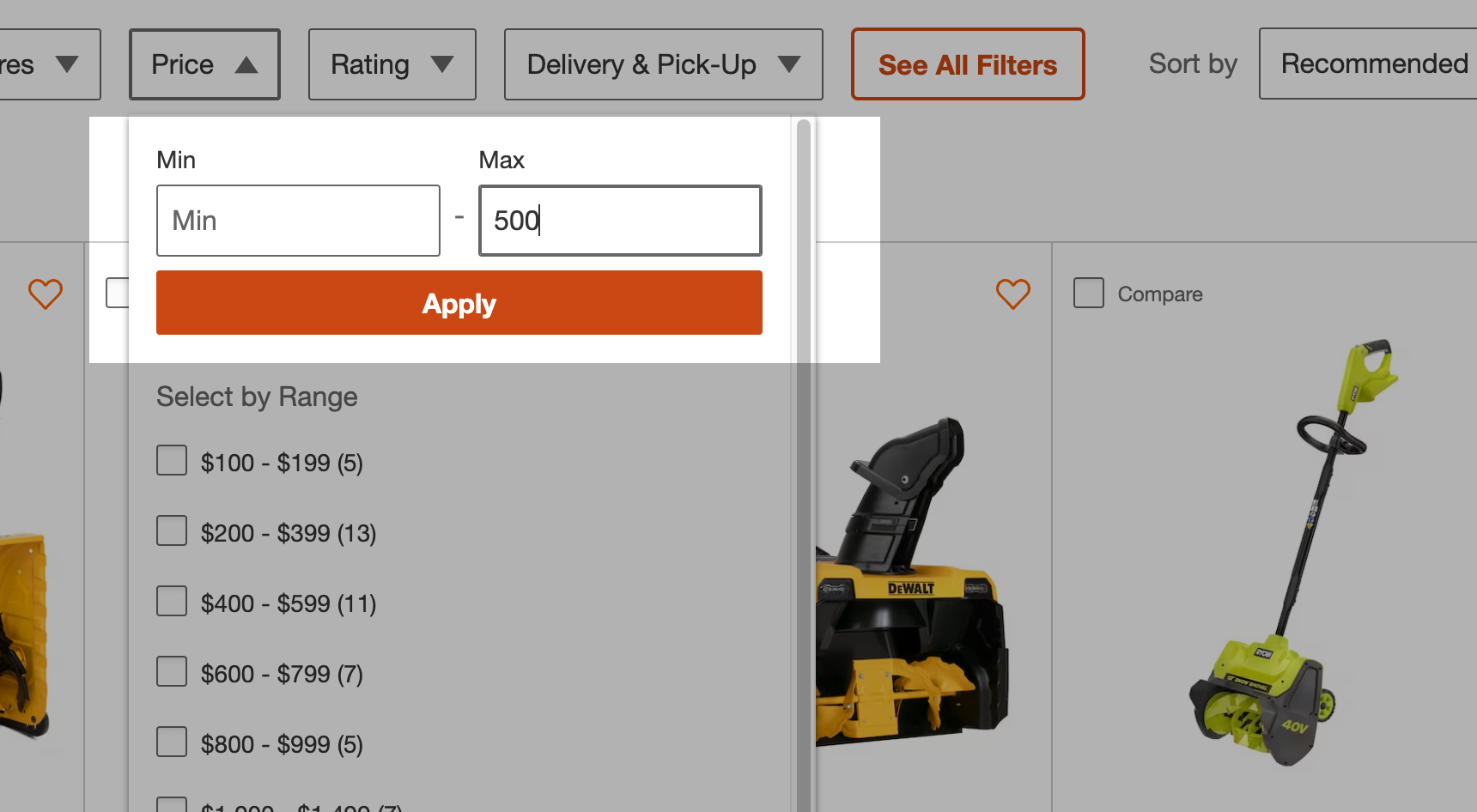 A range slider could be another approach, but the UX there is too finicky IMO. And it takes just one product out-liner price to make the range input seem silly - like having one $5000 product in a collection when most are $100 to $200.
