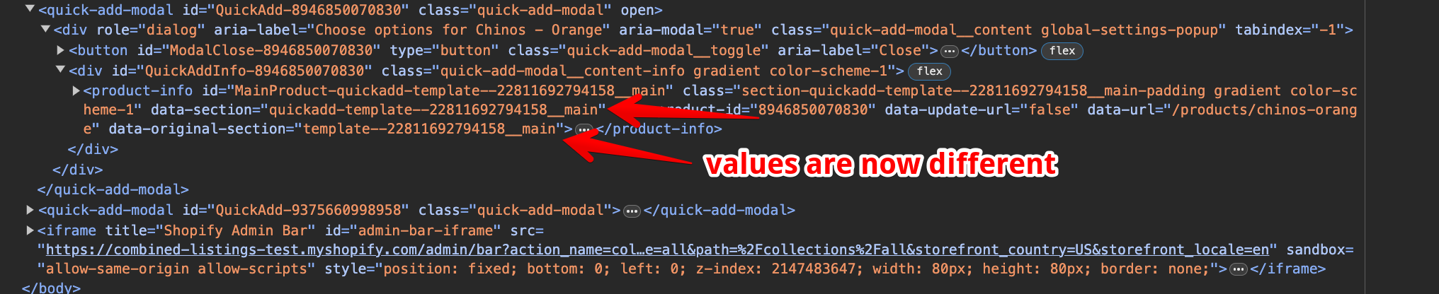 * (Shopify#3492) Fix volume pricing message jumpiness when switching between combined listings; update page title when switching between combined listings; fix unselected option value bug in Safari * Update ID deduplication for quick add modal