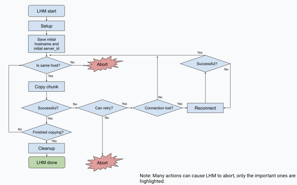 select @@global.hostname). Before every chunk insert, it will check that the hostname is the same as the initial one.In the event of a connection loss, LHM will then start the reconnection procedure.