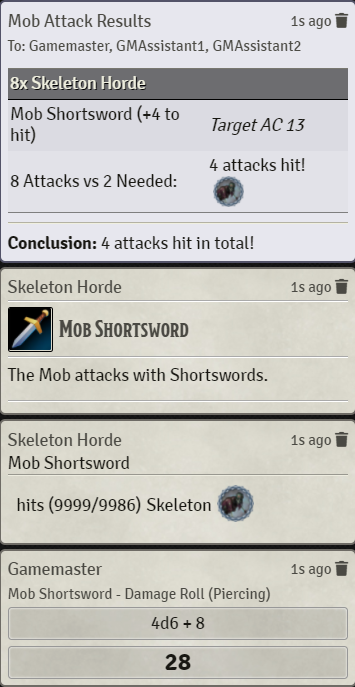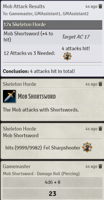I create custom tokens for grouped Mobs such as a Skeleton Horde instead of 4+ Skeletons. When attempting to use this tool, it works and counts the correct attacks and posts them all into chat. However, it also always includes a chat message stating "hits (9999/9982) Mob Name Mob Token", or sometimes its "hits (9999/9986) Mob Name Mob Token".