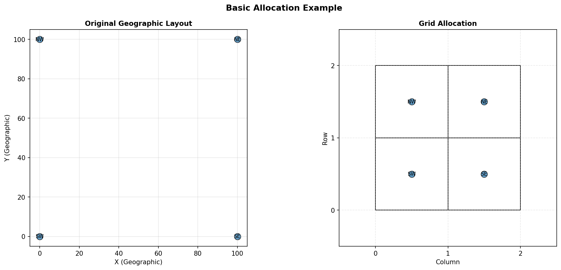 Figure 1: Basic 2×2 grid allocation demonstrating optimal assignment of four corner points to grid cells while preserving geographic relationships. The algorithm minimizes total squared distance between original geographic positions and grid cell centers.