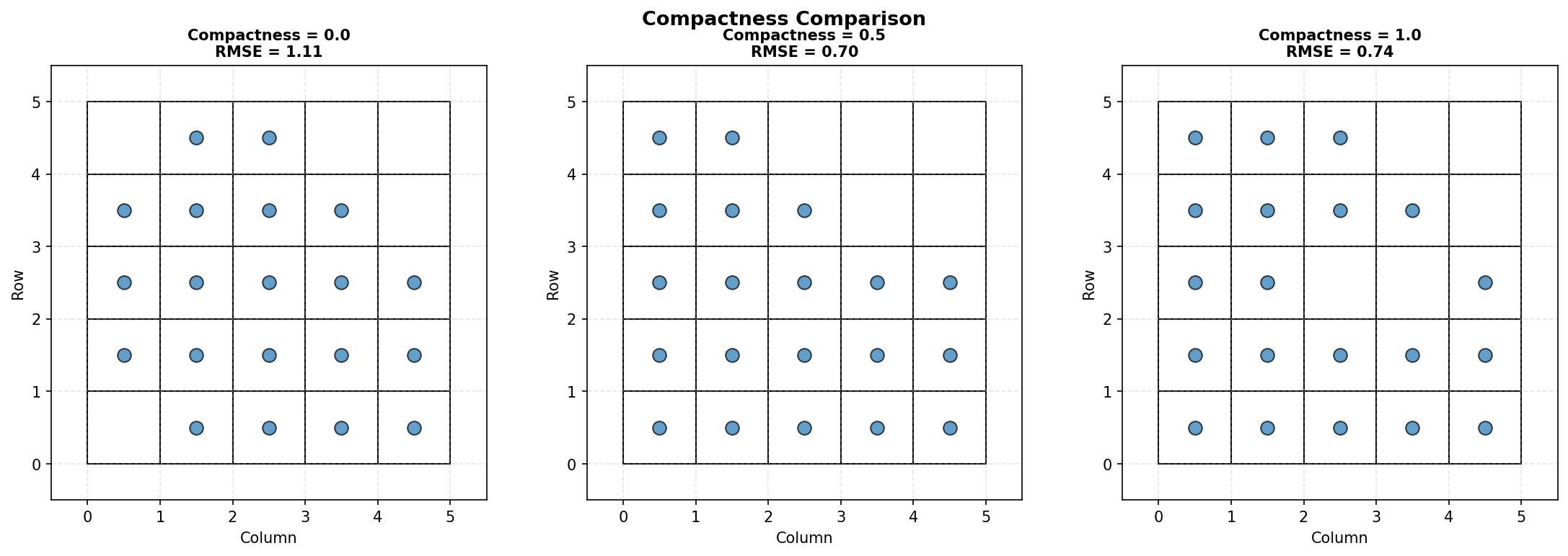 Figure 2: Systematic comparison of compactness parameter effects (0.0, 0.5, 1.0). The compactness parameter controls the trade-off between geographic fidelity and grid clustering: lower values preserve spatial relationships while higher values create more compact, centralized clusters.