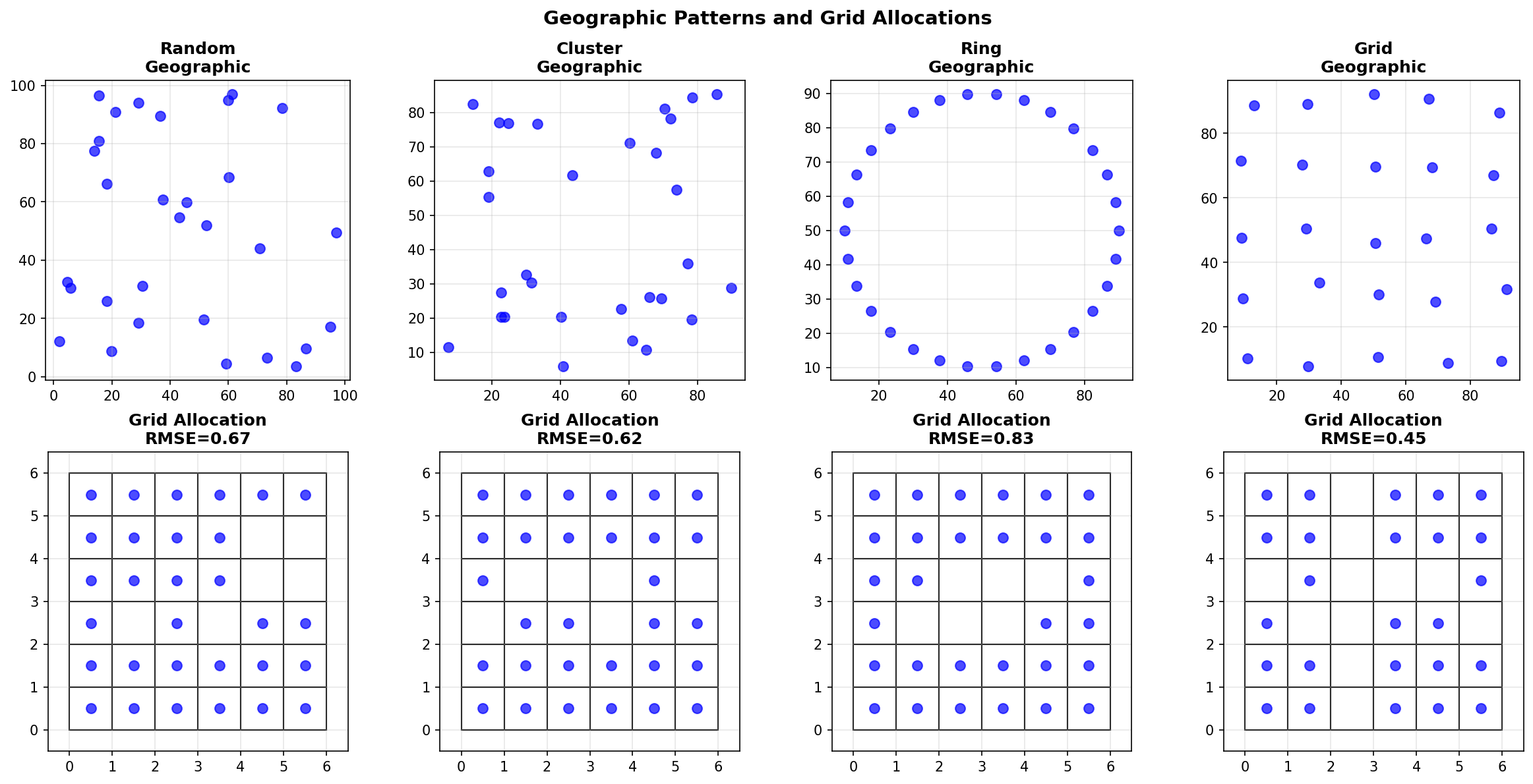 Figure 4: Comparative analysis of different geographic input patterns (random, cluster, ring, grid) and their transformation into grid layouts. Each column shows the original geographic distribution (top row) and resulting grid allocation (bottom row) with quantitative RMSE quality metrics.