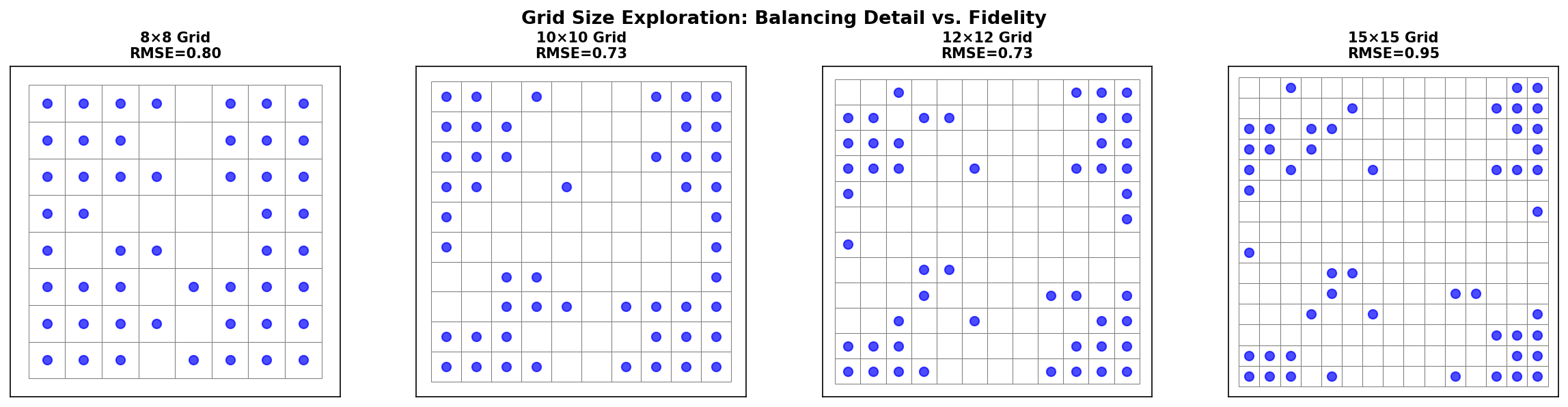 Figure 5: Systematic exploration of grid size effects on allocation quality. Analysis shows how different grid dimensions (8×8, 10×10, 12×12, 15×15) balance between available graphic space and geographic fidelity, with quantitative RMSE measurements for each configuration.