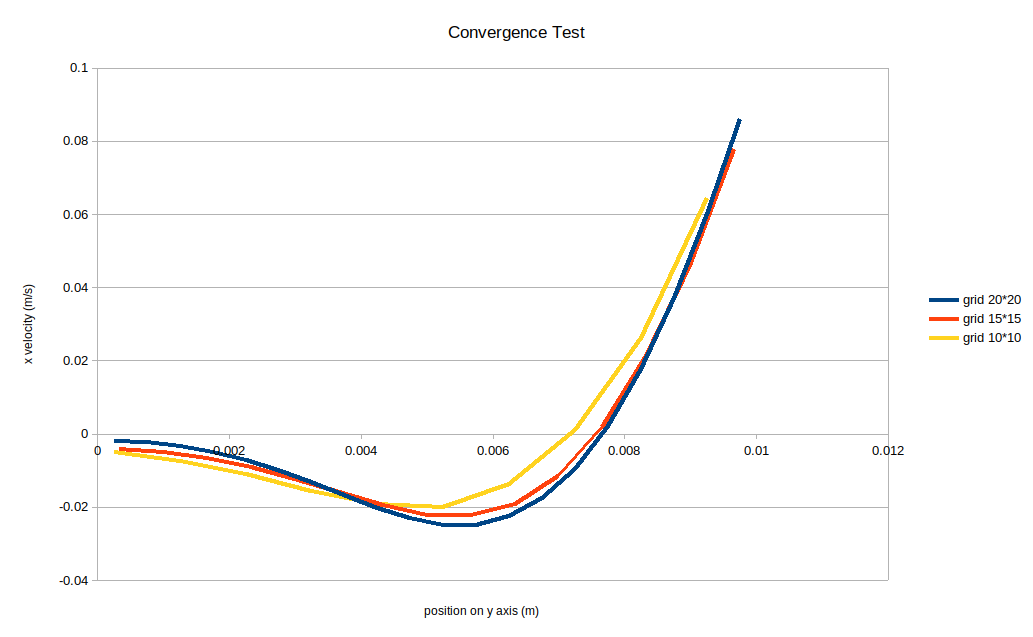 - I test 3 kind of grid size: $1010,\ 1515,\ 20*20$ to see if the value converges. Below are the variation of x-velocity on y axis at x=0.05m.