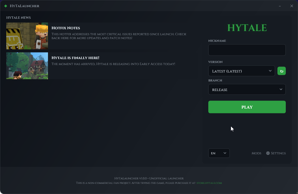 Это неофициальный фан-проект лаунчера для Hytale, который не связан с Hypixel Studios или Hytale и не одобрен ими.