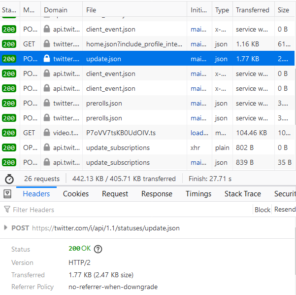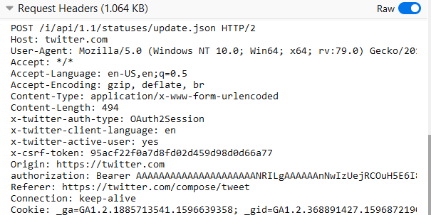 Cookie - _ga=GA1.2.1885713541.1596639359; _gid=GA1.2.368891427.1596872199; kdt=ml9trkPqlkX7LpS4BYsOcvcGUaWnK16y5l3AonNA; remember_checked_on=1; eu_cn=1; gt=1292830647749353478; _sl=1; personalization_id="v1_5GYJjAXSKnXDtgYgx18Hgg=="; guest_id=v1%3A159706997164216568; ct0=95acf22f0a7d8fd02d459d98d0d66a78; ads_prefs="HBERBAA="; twid=u%3D3098023532; auth_token=cda8667f94cdcd9dd60de8b2153f0a92eb52be00; lang=en