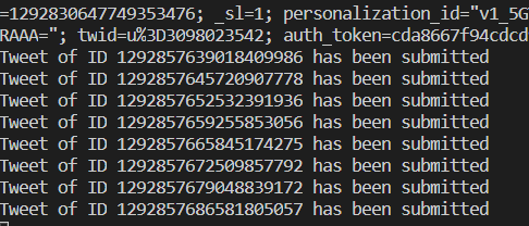 - Like This It Posts 60 Tweets with your account. You can change your count in while loop