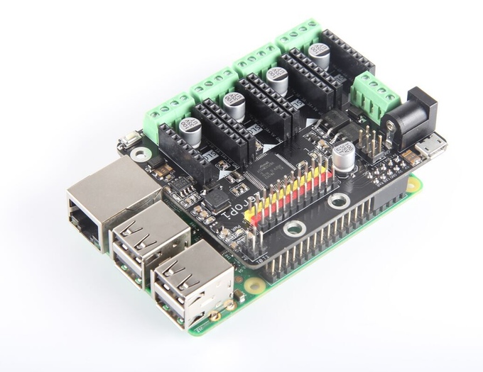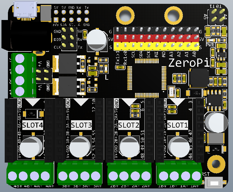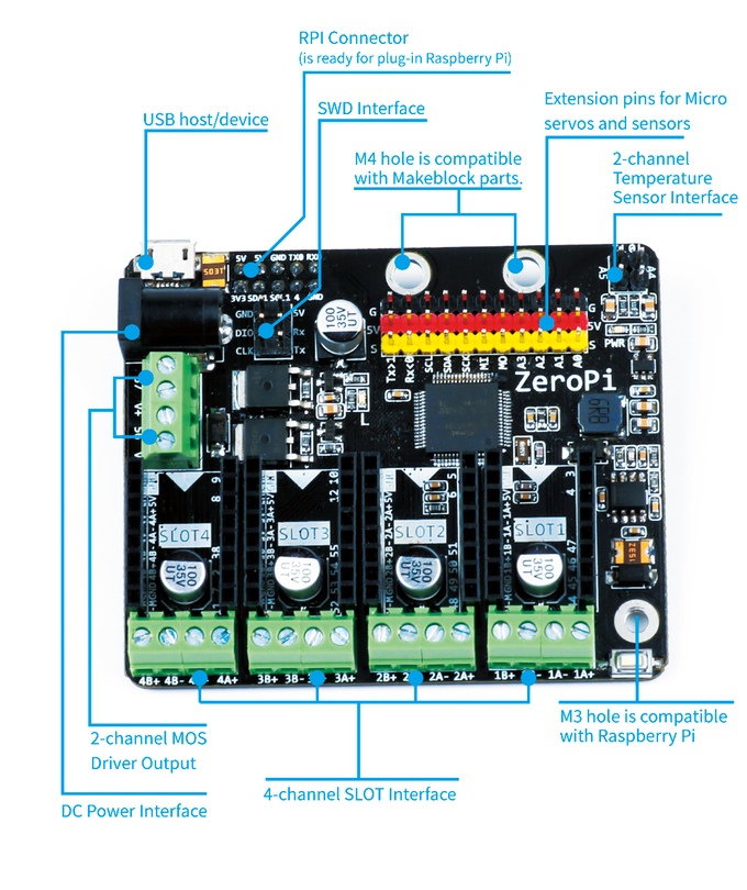 ZeroPi can control 11 micro servos and 8 DC motors at the same time (or 4 stepper motors). The 4-channel SLOT module is compatible with common stepper motor and DC motor drivers (such as DRV8825 or A4988 Stepper motor driver and TB6612 DC motor driver). It also support the opens-source sensors.