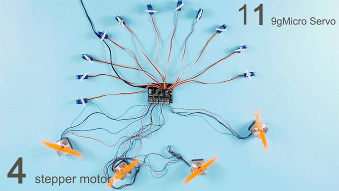 Control 4 stepper motors and 11 micro servos