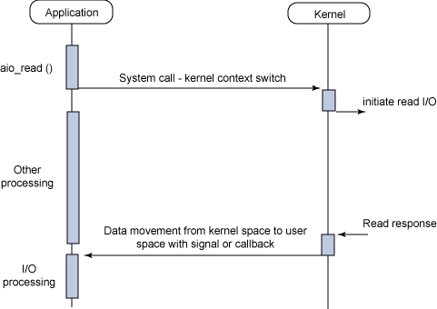 应用程序发出I/O系统调用后挂起(sleep)切换到内核态,当系统调用完成后,系统会唤醒应用程序。