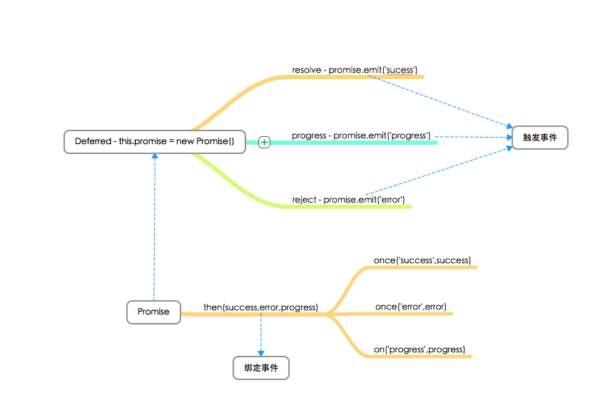 构造函数Promise通过原型链上的then方法绑定事件,当异步调用响应时触发promise实例对象then方法所绑定的事件(emit('sucess'))。这么看来构造函数Deferred貌似没有存在的必要,然而如果省去了Deferred,异步调用中就需要调用Promise内部定义的事件,这样就耦合的有点厉害了。图中Promise是通过给原型方法then自定义事件来绑定callback函数的,实际上也不一定非得通过自定义事件这种模式,这只是一种实现方式而已,不要因此禁锢了思想。