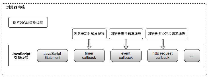 浏览器的主要线程包括:Javascript线程,UI渲染线程,定时触发线程,事件触发线程,web请求线程等。参见:JavaScript Event Loop 浅析。