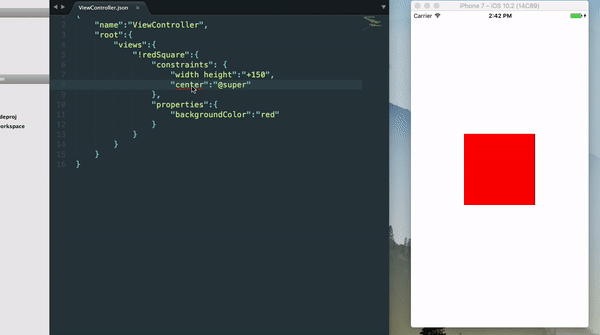 Here I am running a blank application in the simulator side-by-side with a ViewController layout described in JSON, which is loaded by the default View Controller. The app has connected to EverLayout Bridge which is serving it layout updates ever time I save the layout file.