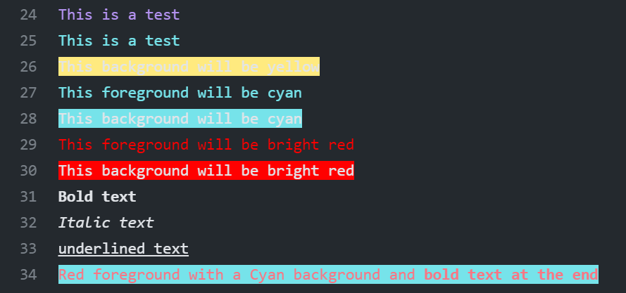 There are a bunch of NPM packages that can be used to assist with this, but I intentionally choose to document the raw ANSI codes. Towards the end I call out one NPM package that I tested and have found to work pretty well. Some popular ones such as chalk don't work because of how they handle string prototypes.