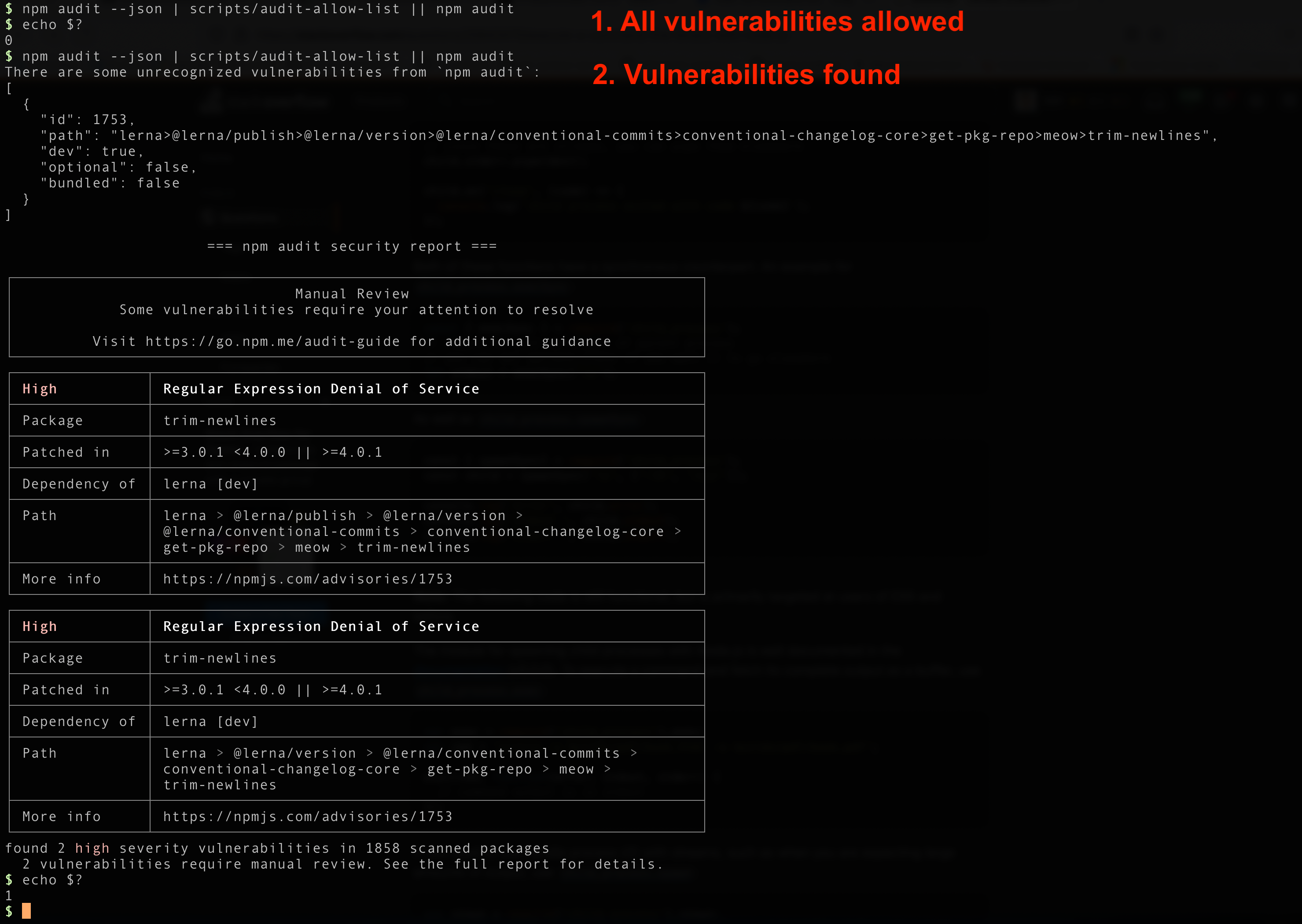 npm audit fix. However, thelernapackage, which is a dev dependency, needs to be updated (discussion). Therefore, I'm changing the workflow to run with--production, which excludes dev dependencies.Sample output: