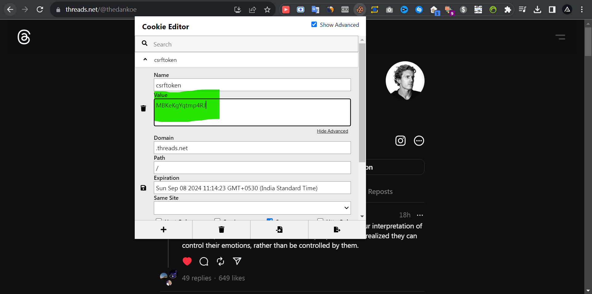 sessionidandcsrftokencookie is required to authenticate againstThreadsin order to have access to the required services.- Using any extensions like