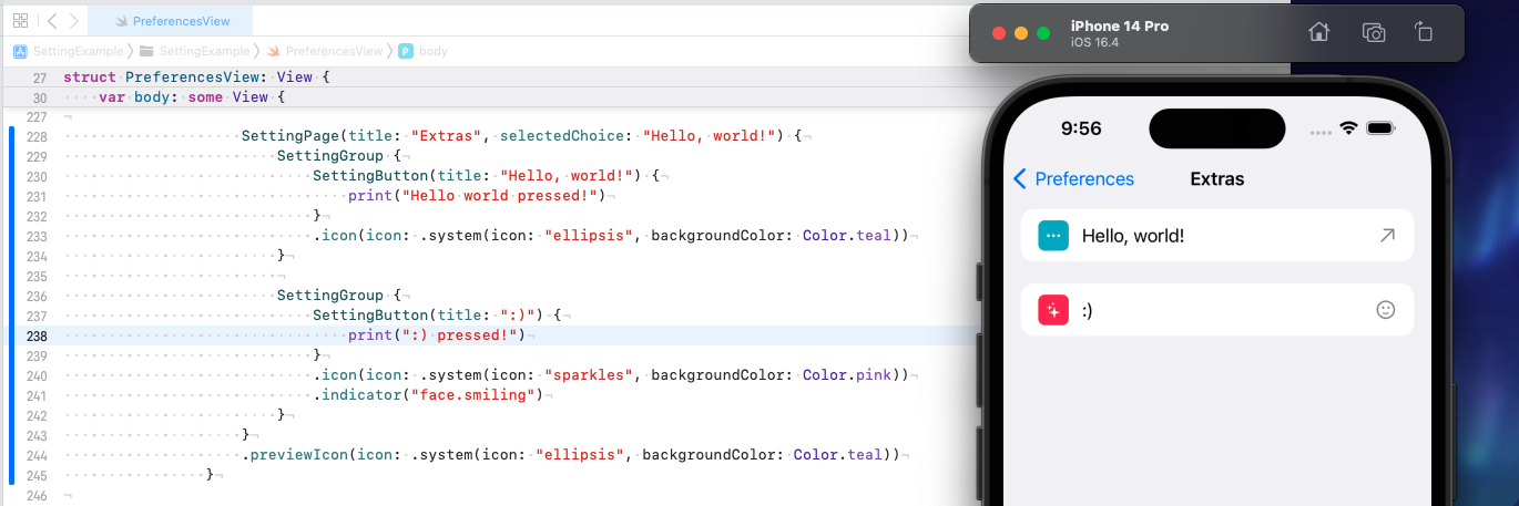 Added an example: SettingPage(title: "Extras", selectedChoice: "Hello, world!") {