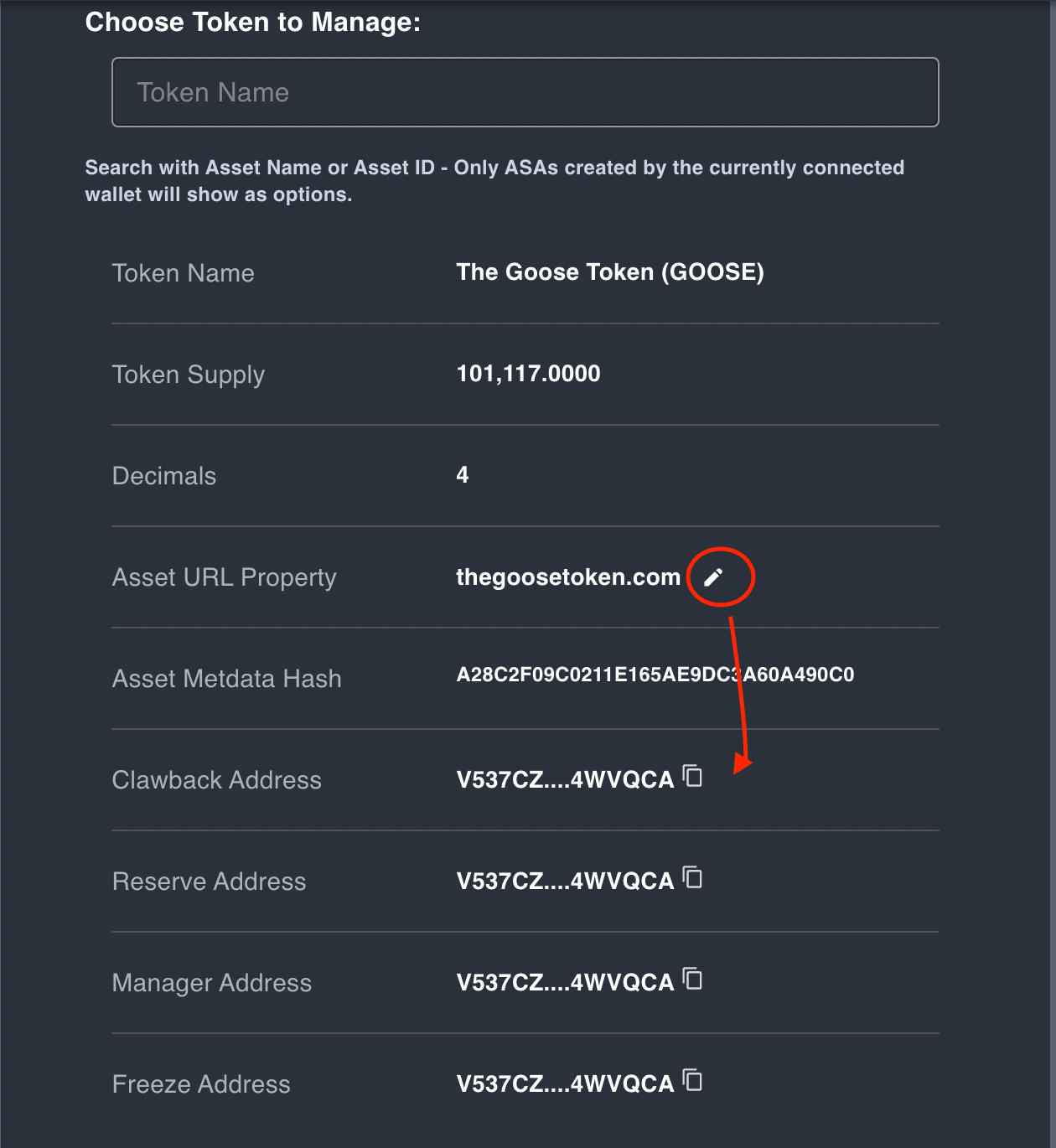 Per Algorand Documentation only clawback, reserve, manager, and freeze fields can be edited after asa creation so remove the edit icon from asset url and add it to the editable fields.