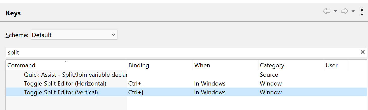 I see. Is ctrl+shift+[ an alternative keybinding for split editor in Eclipse? (If not: what is the benefit of providing a keybinding, that is not the same as in Eclipse as part of these eclipse-keybindings?) |